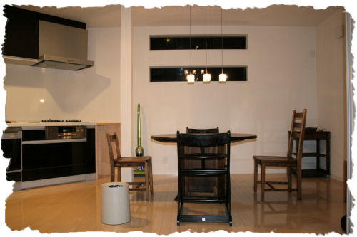 キッチンはダイニングの西側の三角形部分に配されてます。